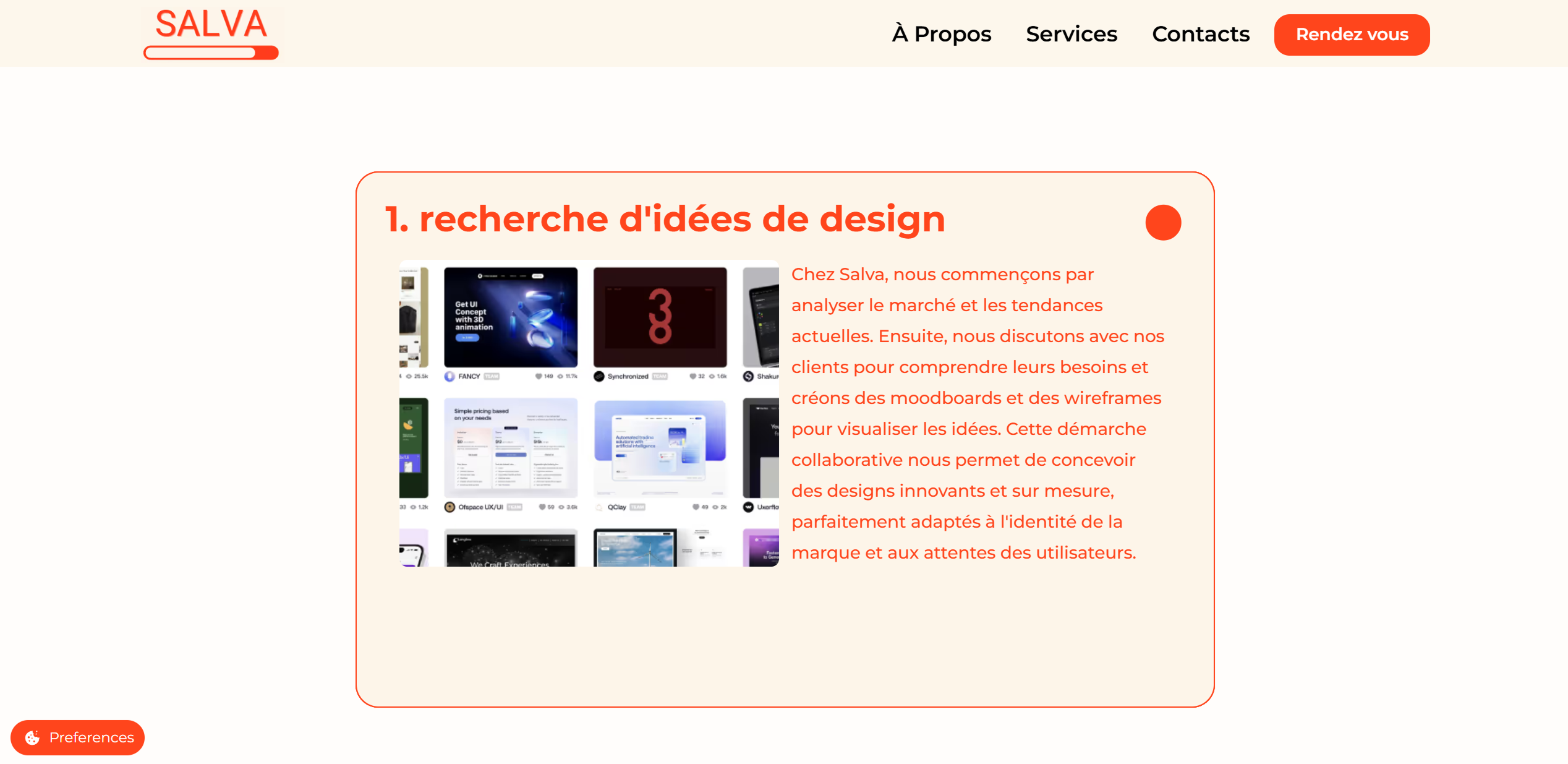 - "Chez Salva" : "Collaboration active avec les clients pour intégrer leurs idées et créer des sites web sur mesure efficacement"